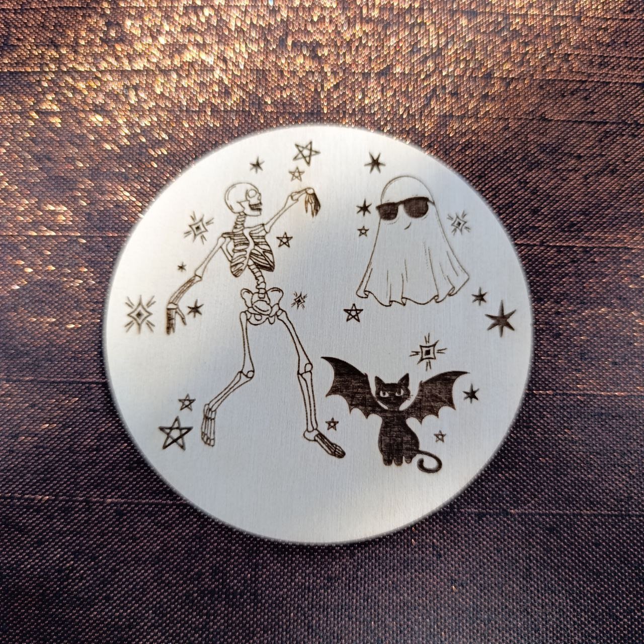 Un sous-bock « Danse funèbre » (10 cm, bois de tilleul) pour accompagner vos boissons d’automne ou tous vos rituels cosy.