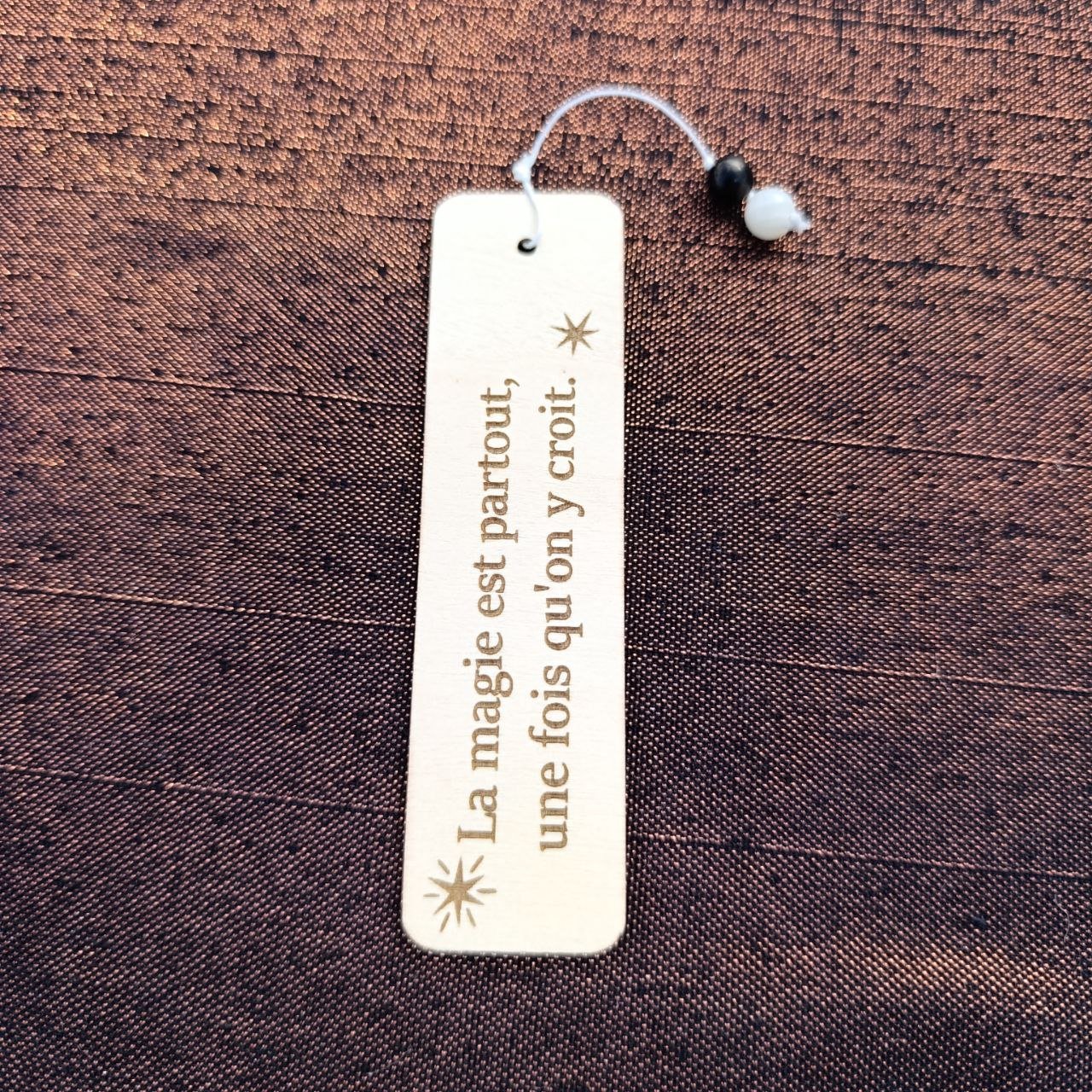 Un marque-page citation « La magie est partout une fois qu’on y croit », réalisé en bois de tilleul, pierres de jais et de lune, pour veiller sur chacune de vos lectures nocturnes.