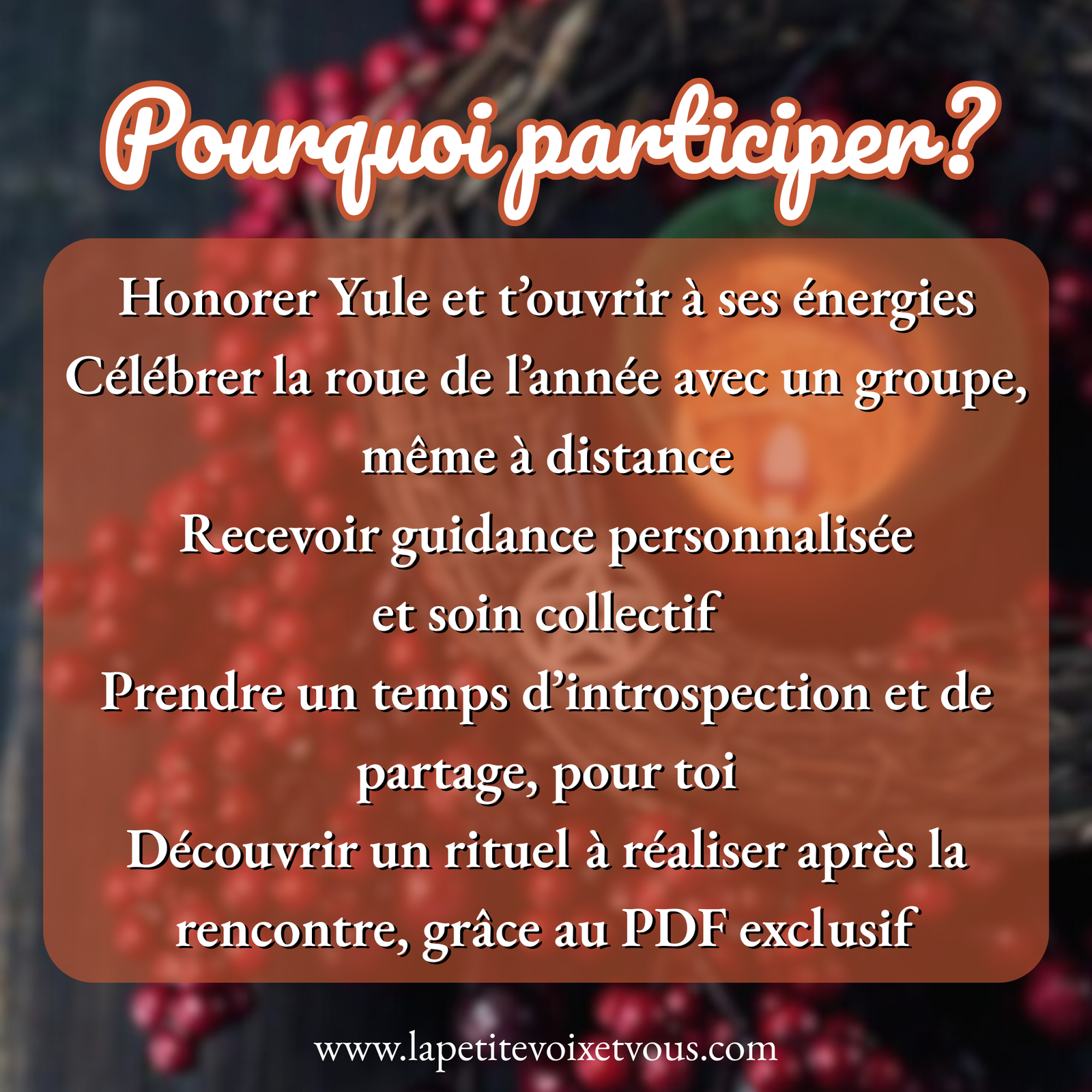 Ce cercle est fait pour toi si tu as envie de célébrer le solstice autrement, de te relier aux traditions païennes autour de Yule, ou de partager un moment spirituel sans contrainte géographique. Il est particulièrement indiqué si tu ressens le besoin de te poser avant les fêtes, de trouver un espace pour te recentrer, ou de ritualiser ce passage vers la lumière. La visio permet de vivre un cercle intime, soutenant et sécurisant, même depuis chez toi.