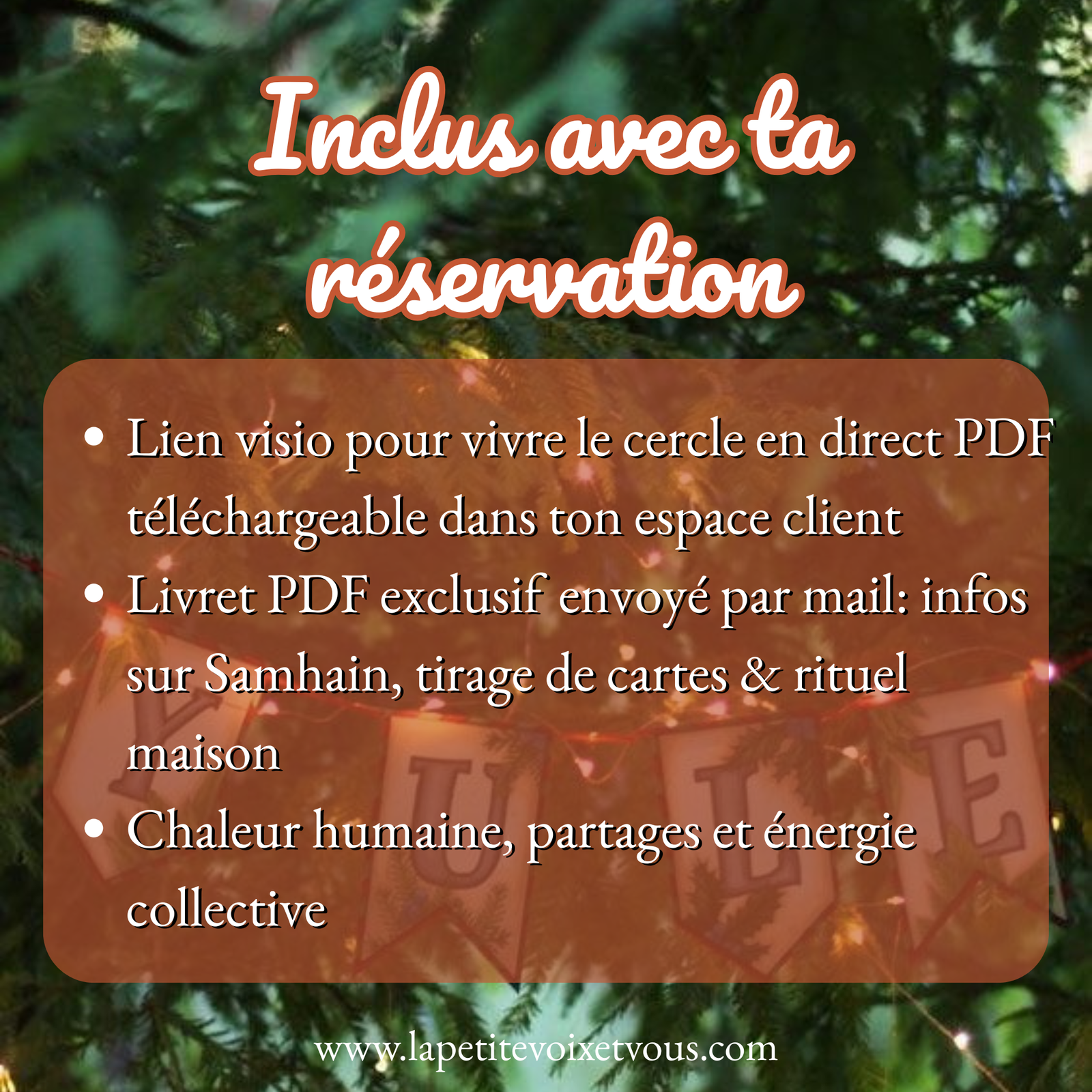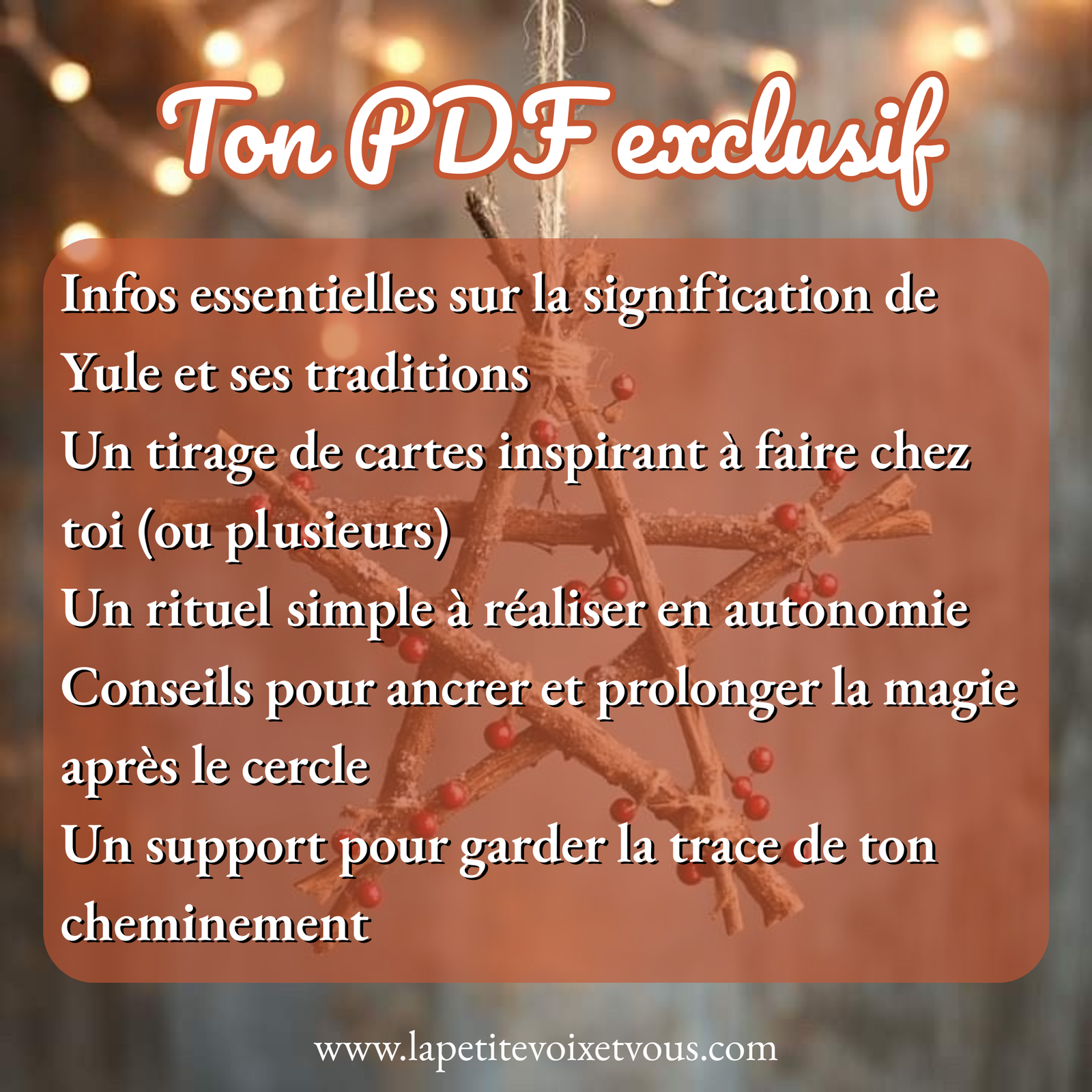 La veille, tu reçois également un livret PDF à télécharger : informations clés sur Yule, modèles de tirage et un rituel à réaliser chez toi entre Yule et Imbolc, pour prolonger la cérémonie.